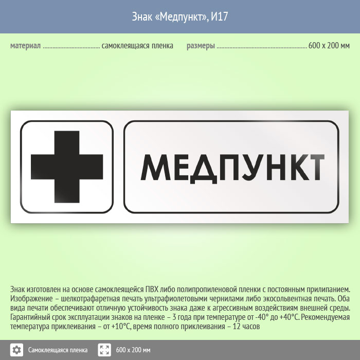 Знак «Медпункт», И17 (пленка, 600х200 мм) в Курске купить