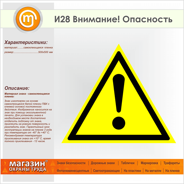 Знак «Внимание! Опасность», И28 (пленка, сторона 500 мм) в Курске купить