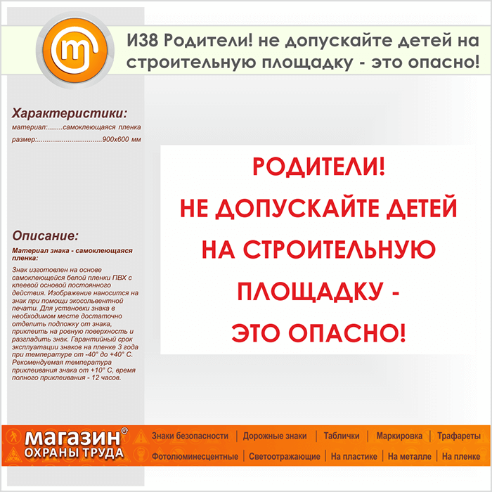 Знак «Родители! не допускайте детей на строительную площадку - это опасно!», И38 (пленка, 900х600 мм) в Курске купить