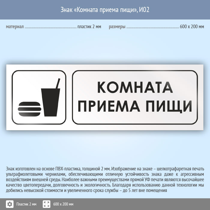 Знак «Комната приема пищи», И02 (пластик, 600х200 мм) в Курске купить