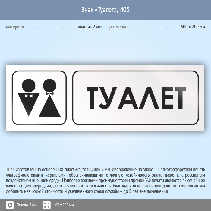 Знак «Туалет», И05 (пластик, 600х200 мм) в Курске купить