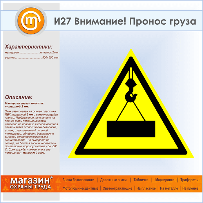 Знак «Внимание! Пронос груза», И27 (пластик, сторона 500 мм) в Курске купить