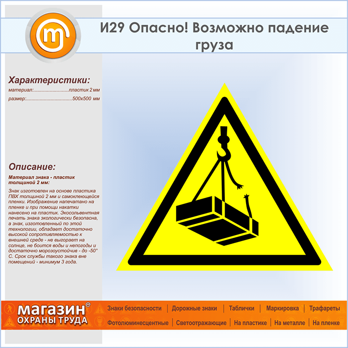Знак «Опасно! Возможно падение груза», И29 (пластик, сторона 500 мм) в Курске купить