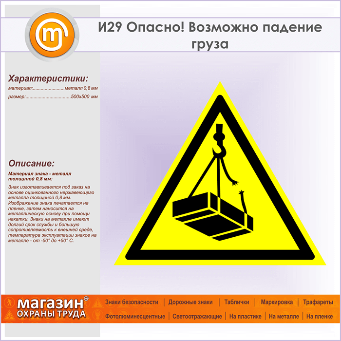 Знак «Опасно! Возможно падение груза», И29 (металл, сторона 500 мм) в Курске купить