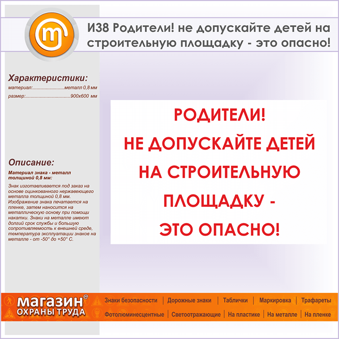 Знак «Родители! не допускайте детей на строительную площадку - это опасно!», И38 (металл, 900х600 мм) в Курске купить