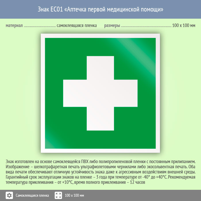 Знак EC01 «Аптечка первой медицинской помощи» (пленка, 100х100 мм) в Курске купить