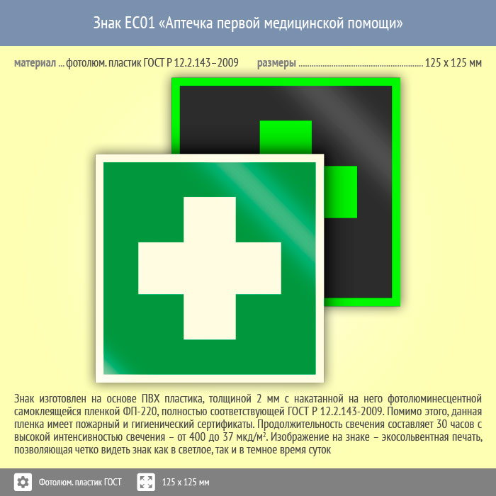 Знак EC01 «Аптечка первой медицинской помощи» (фотолюминесцентный пластик ГОСТ 34428-2018, 125х125 мм) в Курске купить