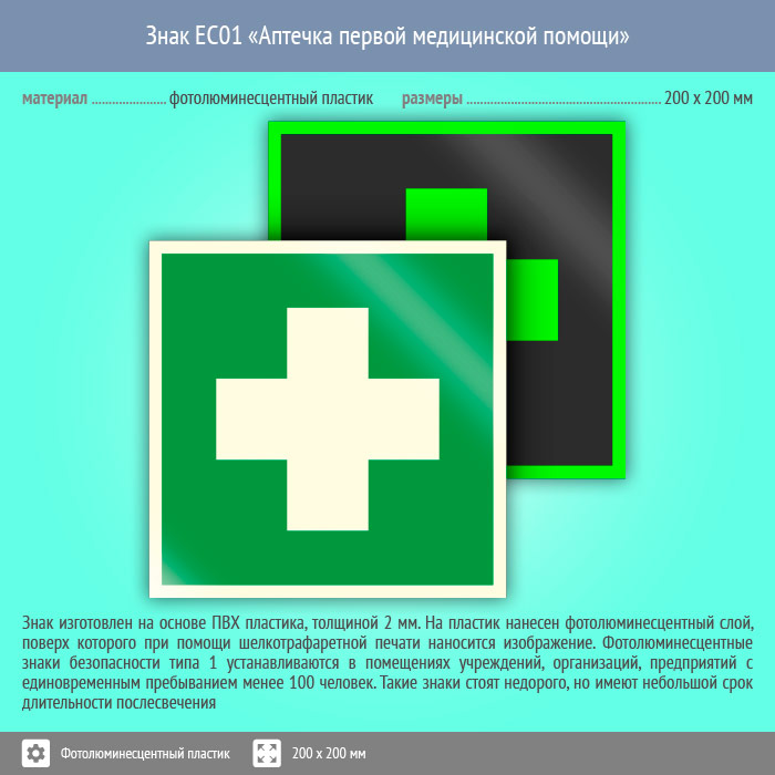 Знак EC01 «Аптечка первой медицинской помощи» (фотолюминесцентный пластик, 200х200 мм) в Курске купить