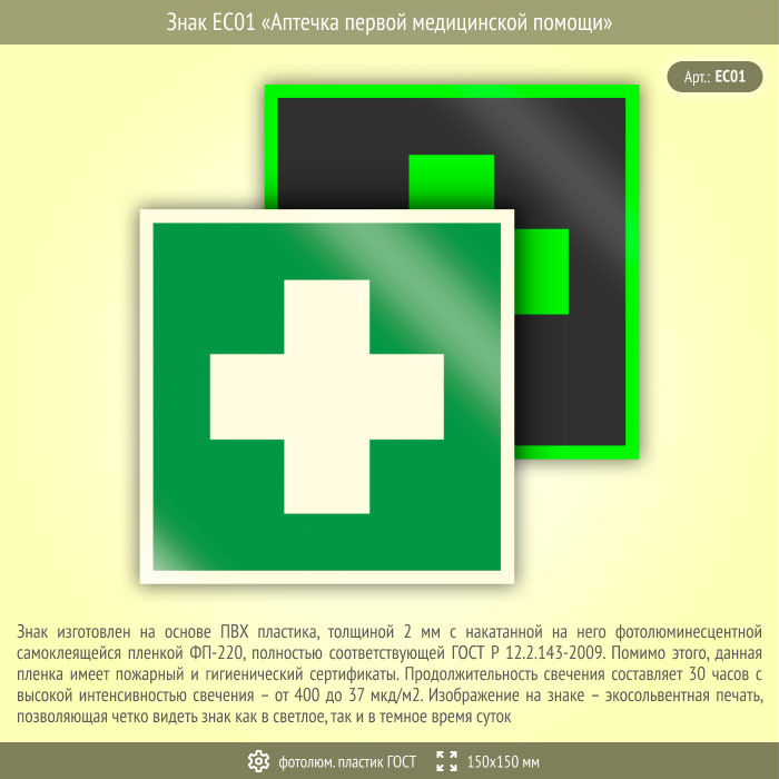 Знак EC01 «Аптечка первой медицинской помощи» (фотолюминесцентный пластик ГОСТ 34428-2018, 150х150 мм) в Курске купить