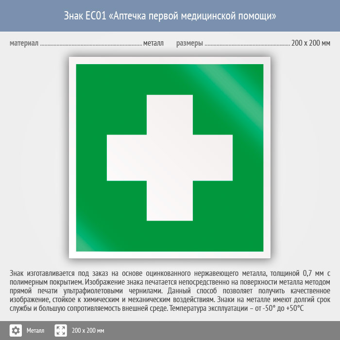 Знак EC01 «Аптечка первой медицинской помощи» (металл, 200х200 мм) в Курске купить