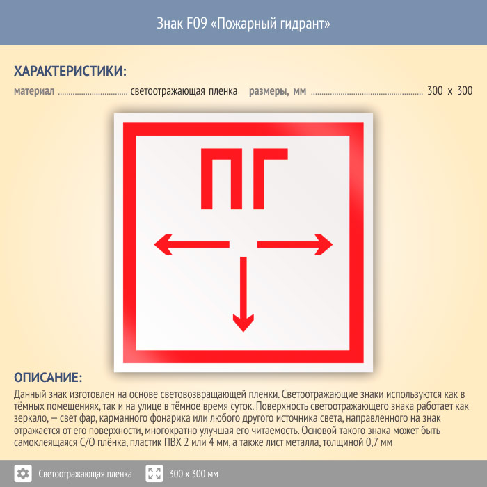 Знак F09 «Пожарный гидрант» (светоотражающая пленка, 300х300 мм) в Курске купить