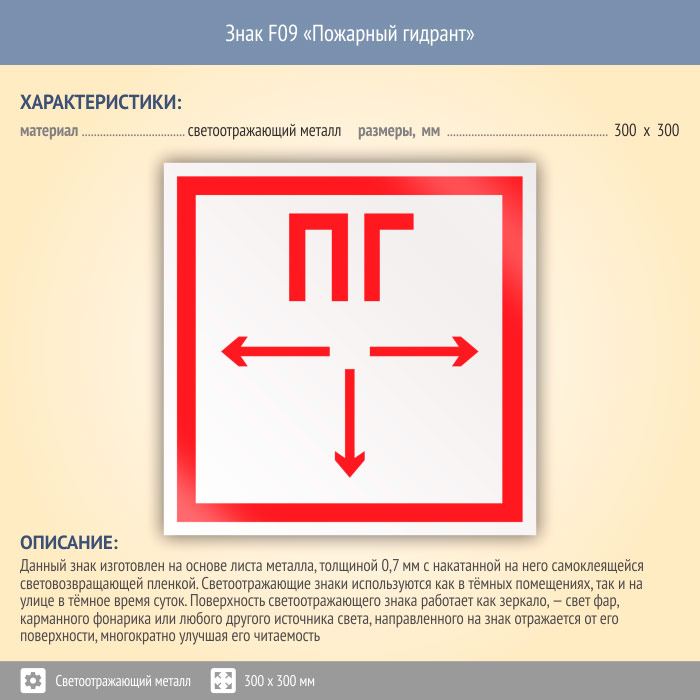 Знак F09 «Пожарный гидрант» (светоотражающий металл, 300х300 мм) в Курске купить