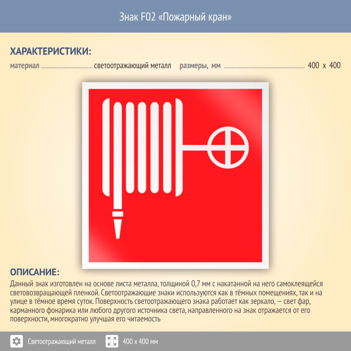 Знак F02 «Пожарный кран» (светоотражающий металл, 400х400 мм) в Курске купить