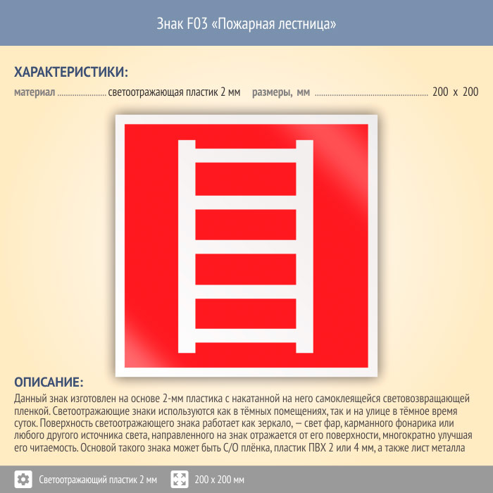 Знак F03 «Пожарная лестница» (светоотражающий пластик, 200х200 мм) в Курске купить