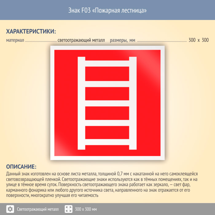 Знак F03 «Пожарная лестница» (светоотражающий металл, 300х300 мм) в Курске купить