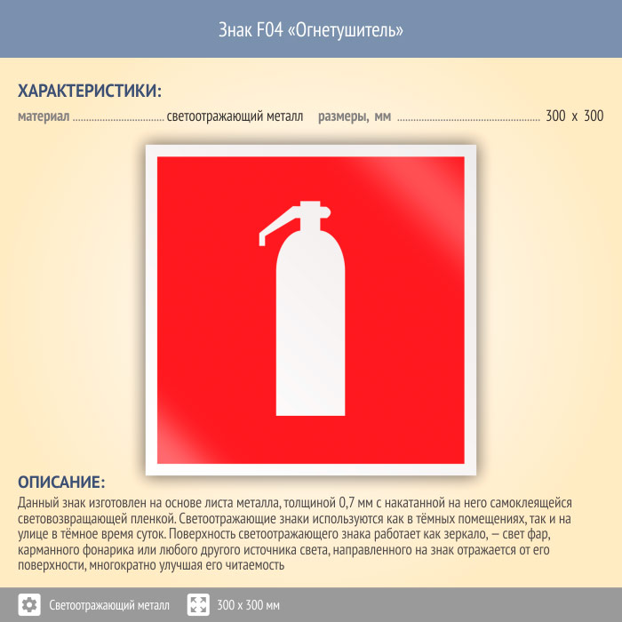 Знак F04 «Огнетушитель» (светоотражающий металл, 300х300 мм) в Курске купить
