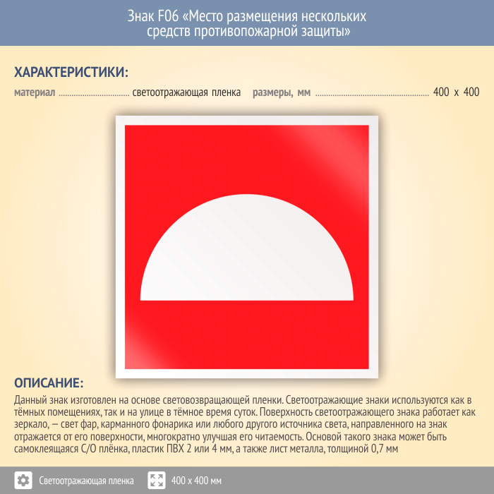 Знак F06 «Место размещения нескольких средств противопожарной защиты» (светоотражающая пленка, 400х400 мм) в Курске купить