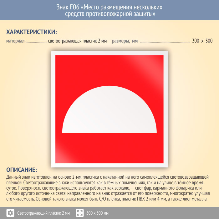 Знак F06 «Место размещения нескольких средств противопожарной защиты» (светоотражающий пластик, 300х300 мм) в Курске купить
