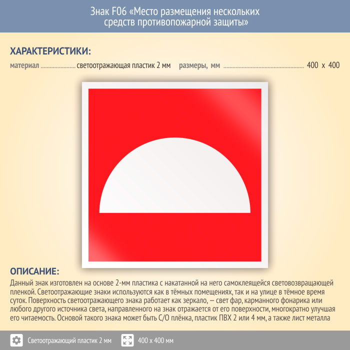 Знак F06 «Место размещения нескольких средств противопожарной защиты» (светоотражающий пластик, 400х400 мм) в Курске купить