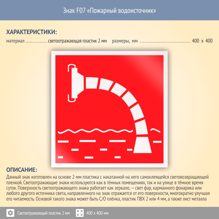 Знак F07 «Пожарный водоисточник» (светоотражающий пластик, 400х400 мм) в Курске купить