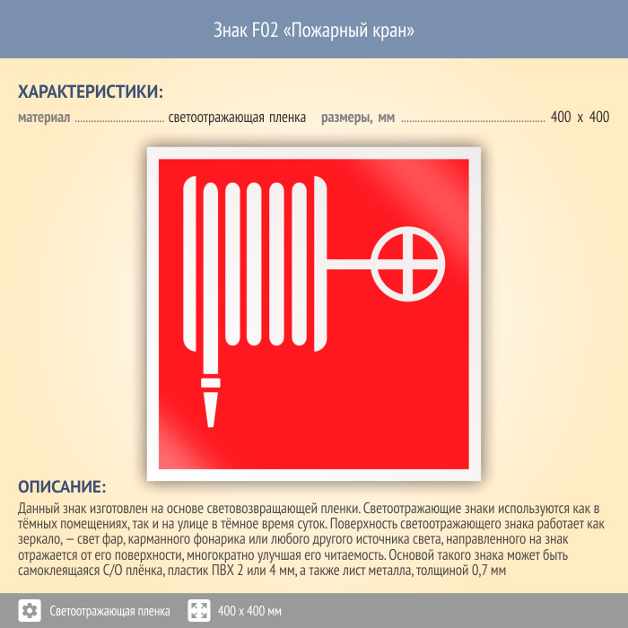 Знак F02 «Пожарный кран» (светоотражающая пленка, 400х400 мм) в Курске купить