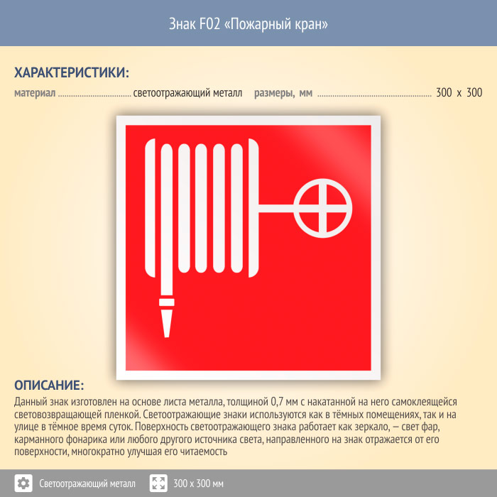 Знак F02 «Пожарный кран» (светоотражающий металл, 300х300 мм) в Курске купить