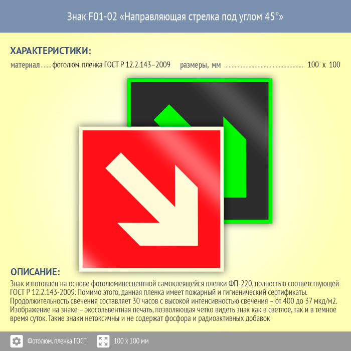 Знак F01-02 «Направляющая стрелка под углом 45°» (фотолюминесцентная пленка ГОСТ 34428-2018, 100х100 мм) в Курске купить