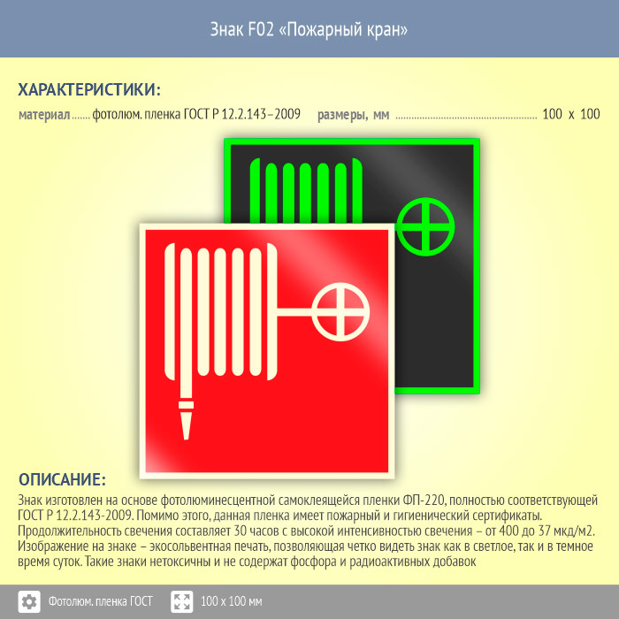 Знак F02 «Пожарный кран» (фотолюминесцентная пленка ГОСТ 34428-2018, 100х100 мм) в Курске купить