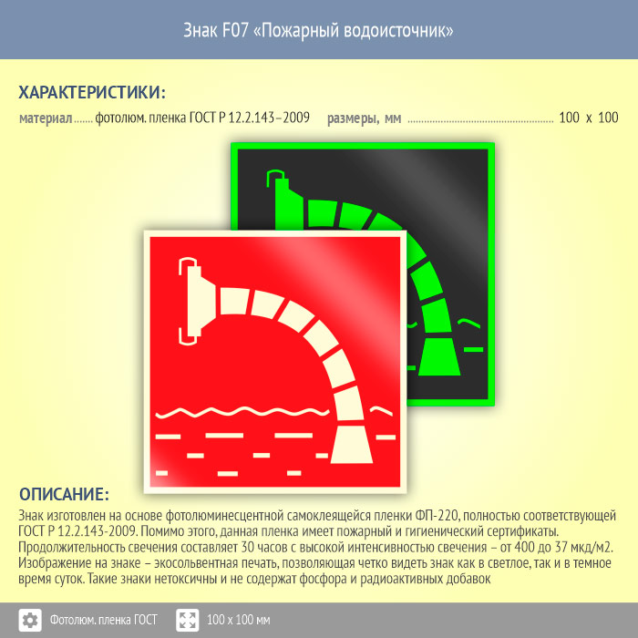 Знак F07 «Пожарный водоисточник» (фотолюминесцентная пленка ГОСТ 34428-2018, 100х100 мм) в Курске купить