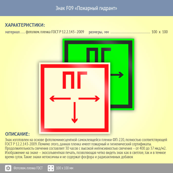Знак F09 «Пожарный гидрант» (фотолюминесцентная пленка ГОСТ 34428-2018, 100х100 мм) в Курске купить