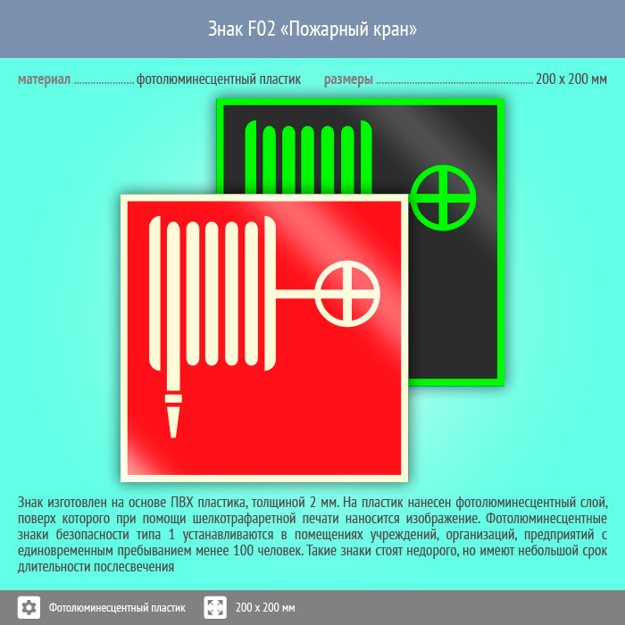 Знак F02 «Пожарный кран» (фотолюминесцентный пластик, 200х200 мм) в Курске купить