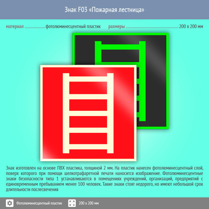 Знак F03 «Пожарная лестница» (фотолюминесцентный пластик, 200х200 мм) в Курске купить