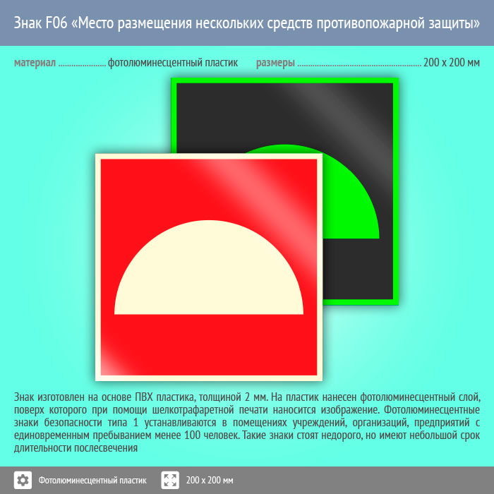 Знак F06 «Место размещения нескольких средств противопожарной защиты» (фотолюминесцентный пластик, 200х200 мм) в Курске купить