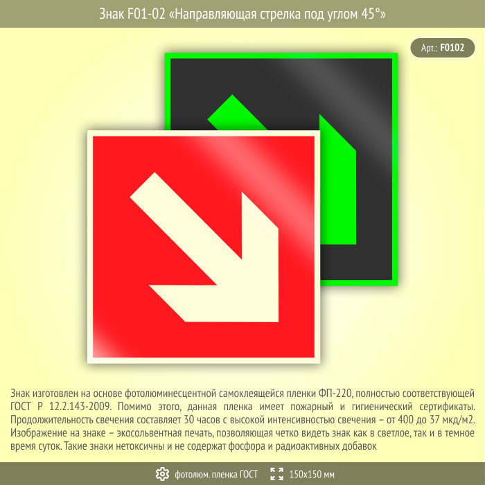 Знак F01-02 «Направляющая стрелка под углом 45°» (фотолюминесцентная пленка ГОСТ 34428-2018, 150х150 мм) в Курске купить