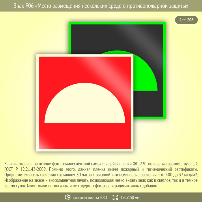 Знак F06 «Место размещения нескольких средств противопожарной защиты» (фотолюминесцентная пленка ГОСТ 34428-2018, 150х150 мм) в Курске купить