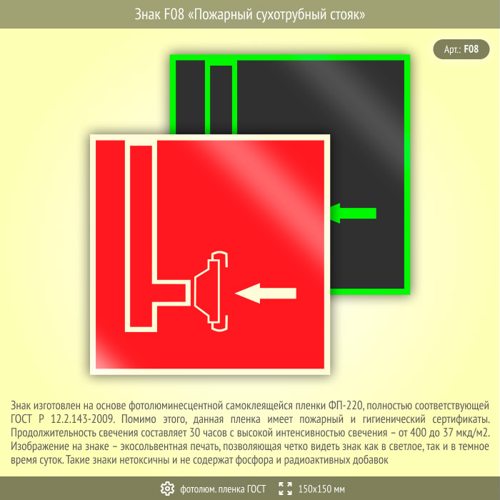 Знак F08 «Пожарный сухотрубный стояк» (фотолюминесцентная пленка ГОСТ 34428-2018, 150х150 мм) в Курске купить