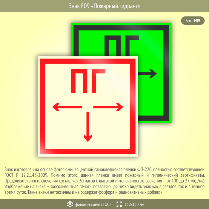 Знак F09 «Пожарный гидрант» (фотолюминесцентная пленка ГОСТ 34428-2018, 150х150 мм) в Курске купить