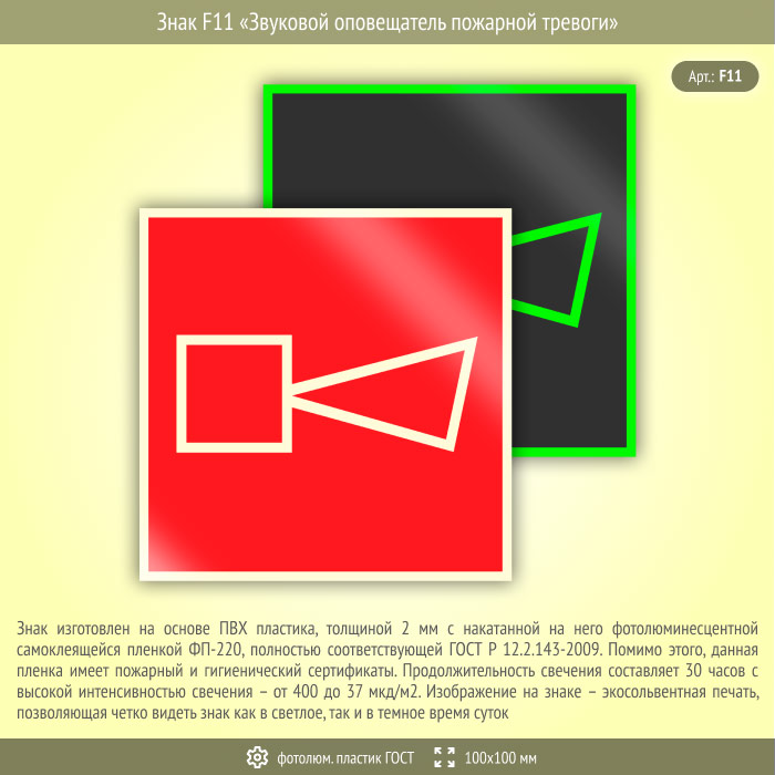 Знак F11 «Звуковой оповещатель пожарной тревоги» (фотолюминесцентный пластик ГОСТ 34428-2018, 100х100 мм) в Курске купить