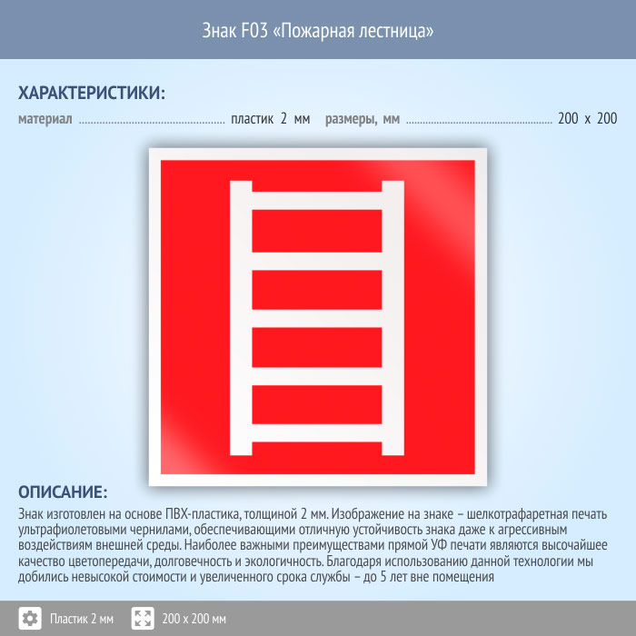Знак F03 «Пожарная лестница» (пластик, 200х200 мм) в Курске купить