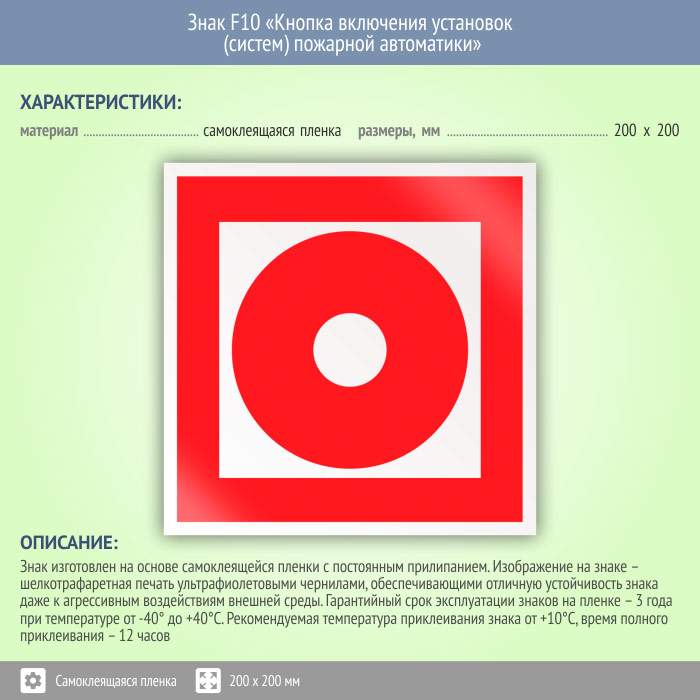 Знак F10 «Кнопка включения установок (систем) пожарной автоматики» (пленка, 200х200 мм) в Курске купить