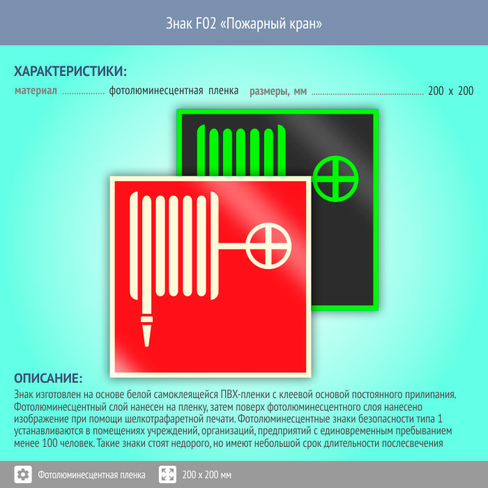 Знак F02 «Пожарный кран» (фотолюминесцентная пленка, 200х200 мм) в Курске купить