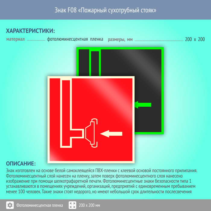 Знак F08 «Пожарный сухотрубный стояк» (фотолюминесцентная пленка, 200х200 мм) в Курске купить