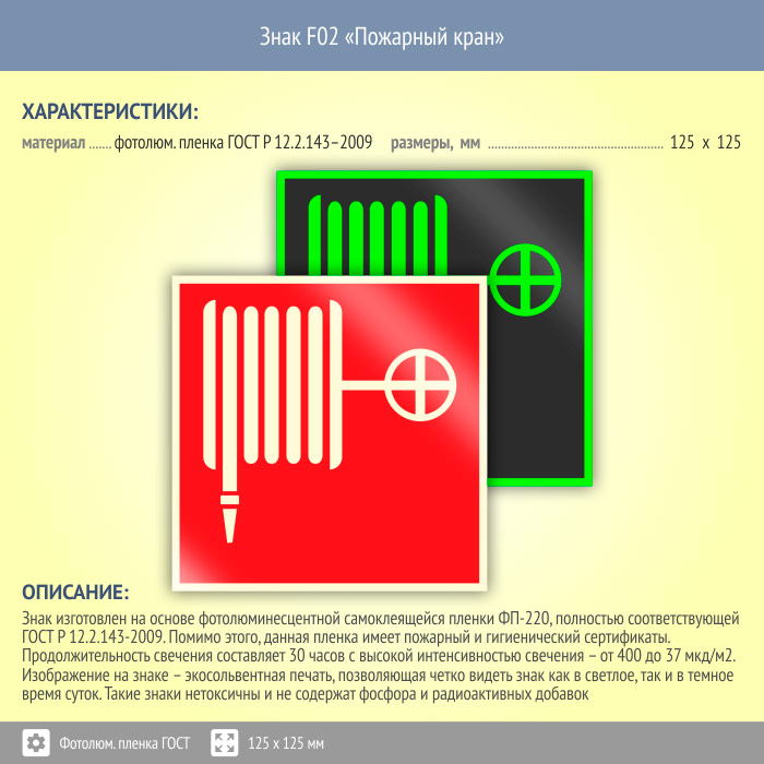 Знак F02 «Пожарный кран» (фотолюминесцентная пленка ГОСТ 34428-2018, 125х125 мм) в Курске купить
