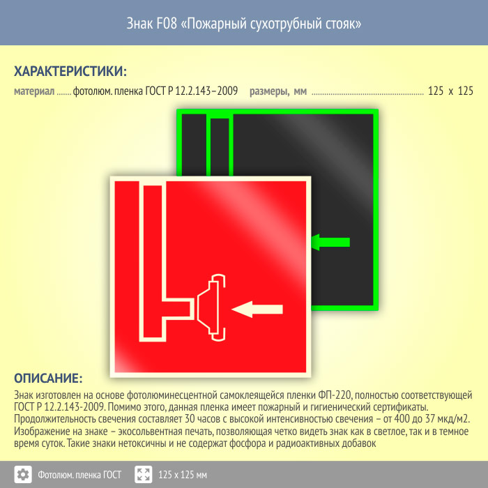 Знак F08 «Пожарный сухотрубный стояк» (фотолюминесцентная пленка ГОСТ 34428-2018, 125х125 мм) в Курске купить