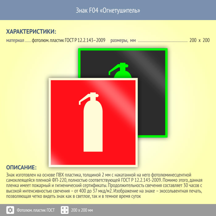 Знак F04 «Огнетушитель» (фотолюминесцентный пластик ГОСТ 34428-2018, 200х200 мм) в Курске купить