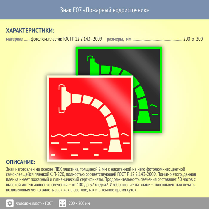Знак F07 «Пожарный водоисточник» (фотолюминесцентный пластик ГОСТ 34428-2018, 200х200 мм) в Курске купить