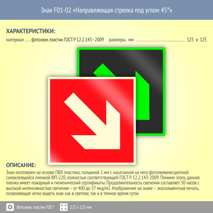 Знак F01-02 «Направляющая стрелка под углом 45°» (фотолюминесцентный пластик ГОСТ 34428-2018, 125х125 мм) в Курске купить